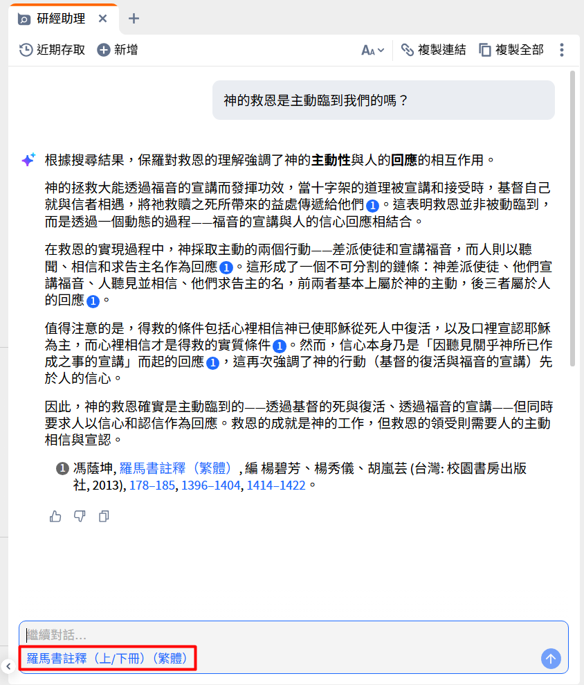 您现在可以进一步精确搜索:确切选择您希望研经助理(Study Assistant)搜索的某一本书或某一套书。例如,在冯荫坤的《罗马书注释》中搜索,神的救恩是主动临到我们的吗?