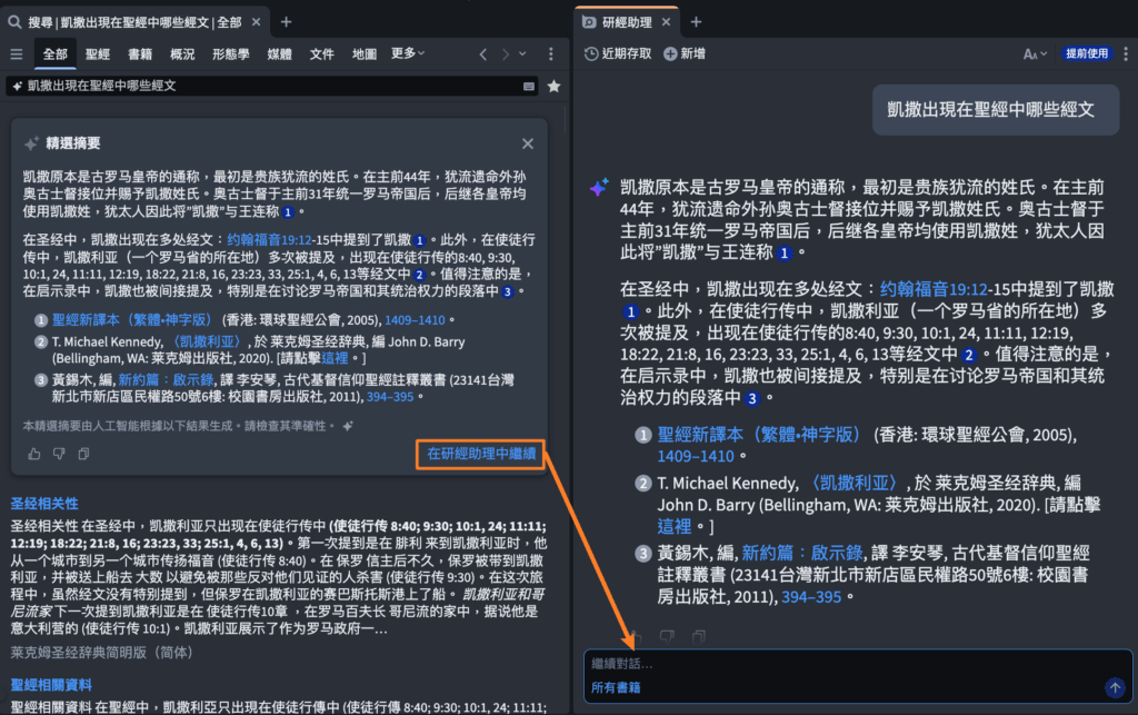 当你询问经文、主题或教义时,研经助理会搜寻你的 Logos 图书数据库,整合结果,并提供具引用来源的清晰答案。每个回答都附有可点开查看原文脉络的内嵌参考资料。你也能提出澄清问题、缩小焦点,或直接点进书籍深入阅读。