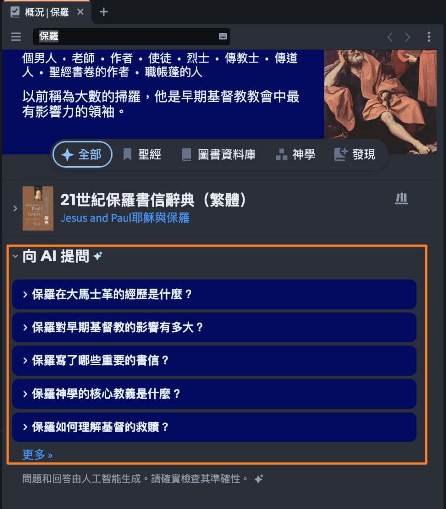 点击任何问题,就能看到有引用来源的答案,也可以直接跳转到研经助理,继续进一步的对话探索。
